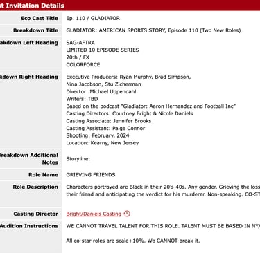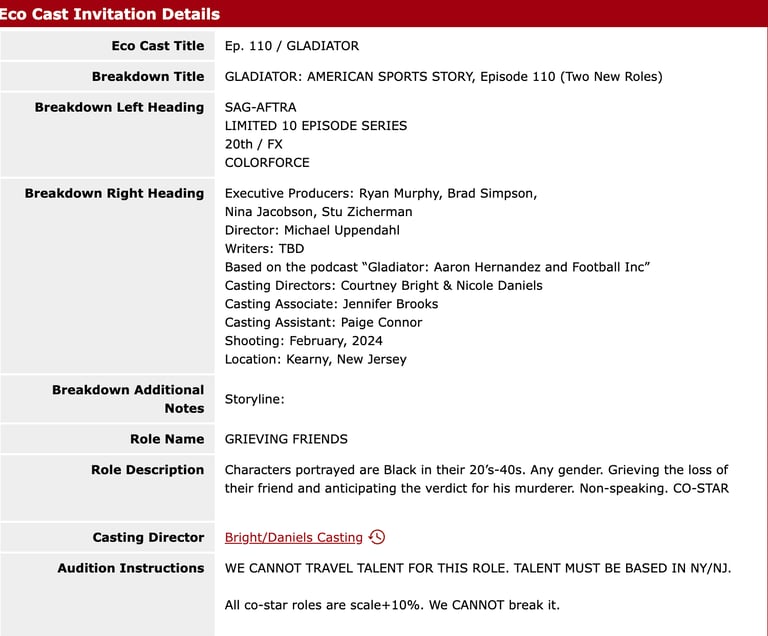 I immediately clicked into the EcoCast for more information. The emails are so vague, what could this project be? A sports documentary? A re-enactment series? I was pleasantly surprised to see it was for a Ryan Murphy project about Aaron Hernandez. As a former (current, who am I kidding!) Gleek I was SO excited for the opportunity to audition for a Ryan Murphy project. Thank you to Bright/Daniels casting for calling me in!